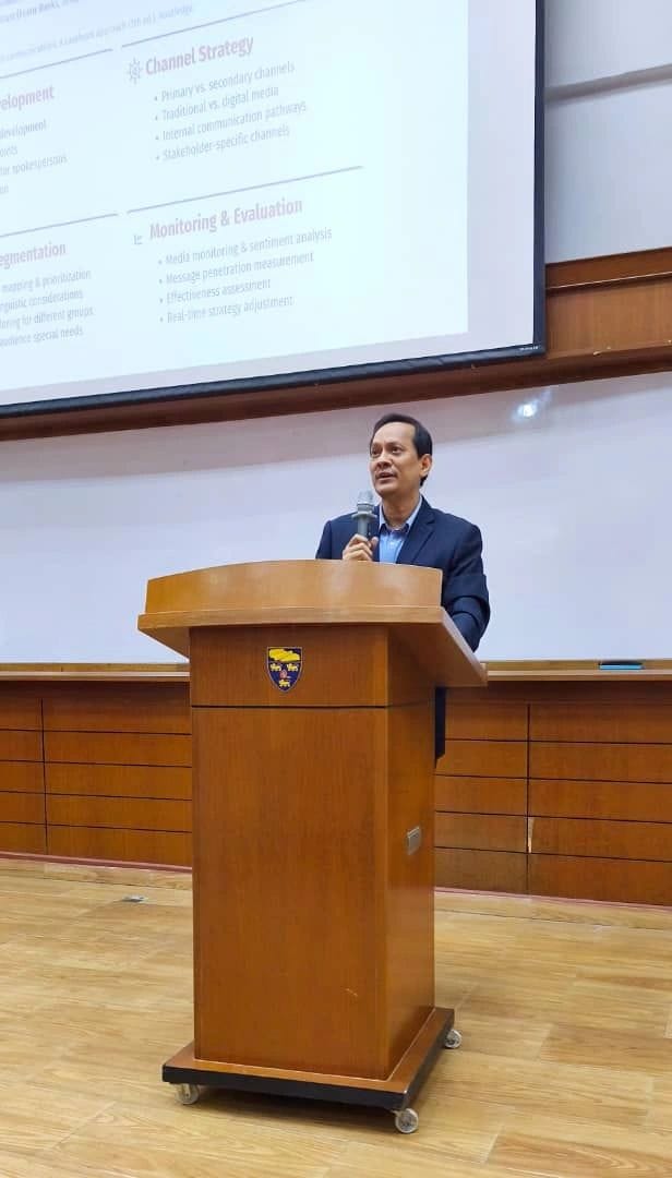 The session moved beyond textbook definitions. Using recent, high-profile Malaysian case studies—from ministerial response analyses to sports federation controversies—the discussion focused on practical crisis leadership. The goal was to demonstrate how frameworks like Situational Crisis Communication Theory (SCCT) are applied under real pressure, transforming students from passive learners into strategic thinkers prepared for the “war room” dynamics of a modern crisis.