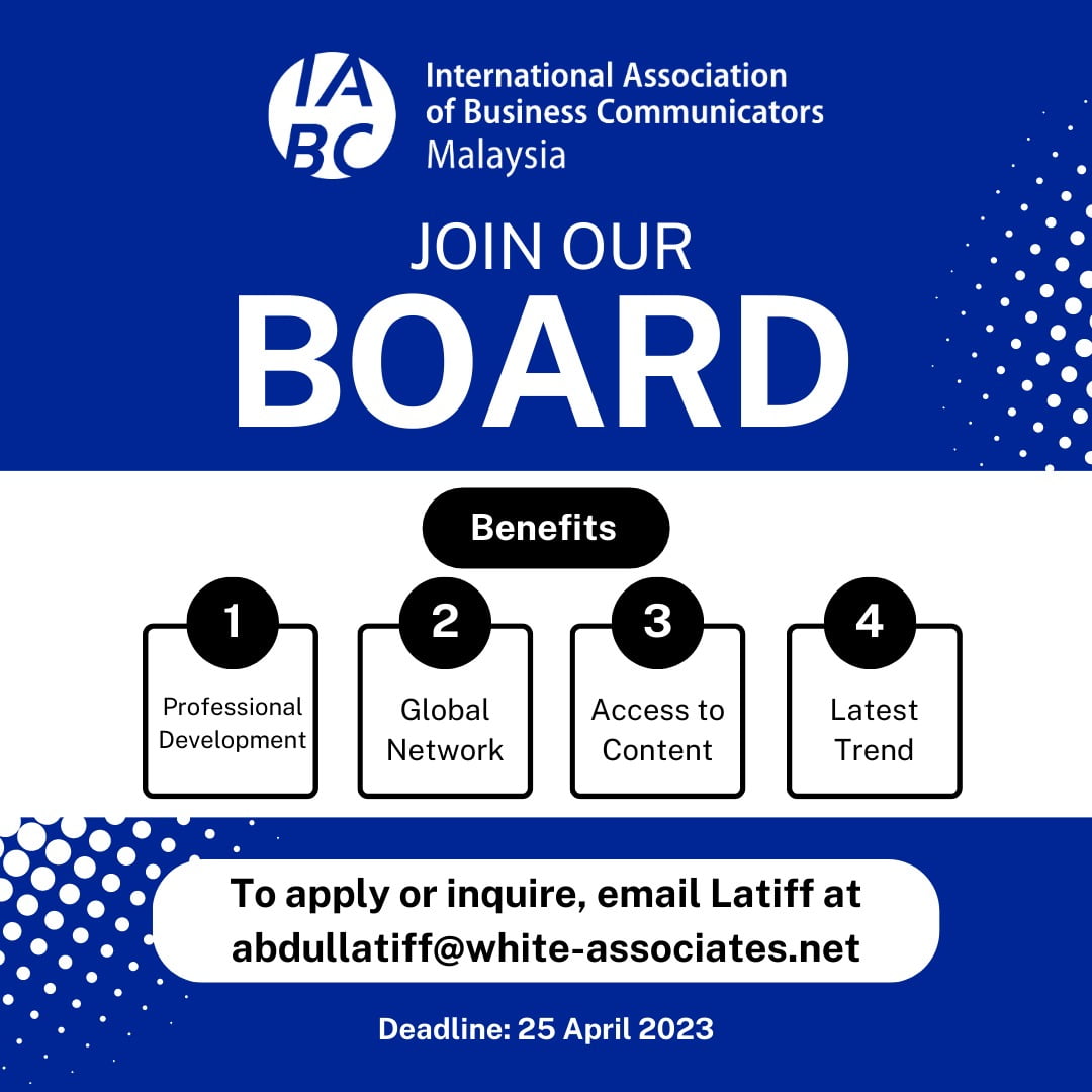 International Association for Business Communicators (IABC) Malaysia is calling for volunteers to join the IABC Malaysia Board for 2023/2024 term.
